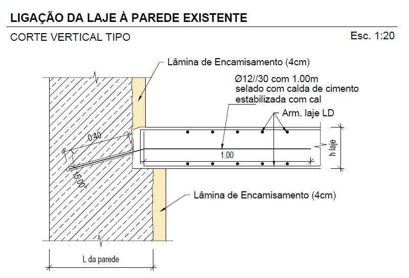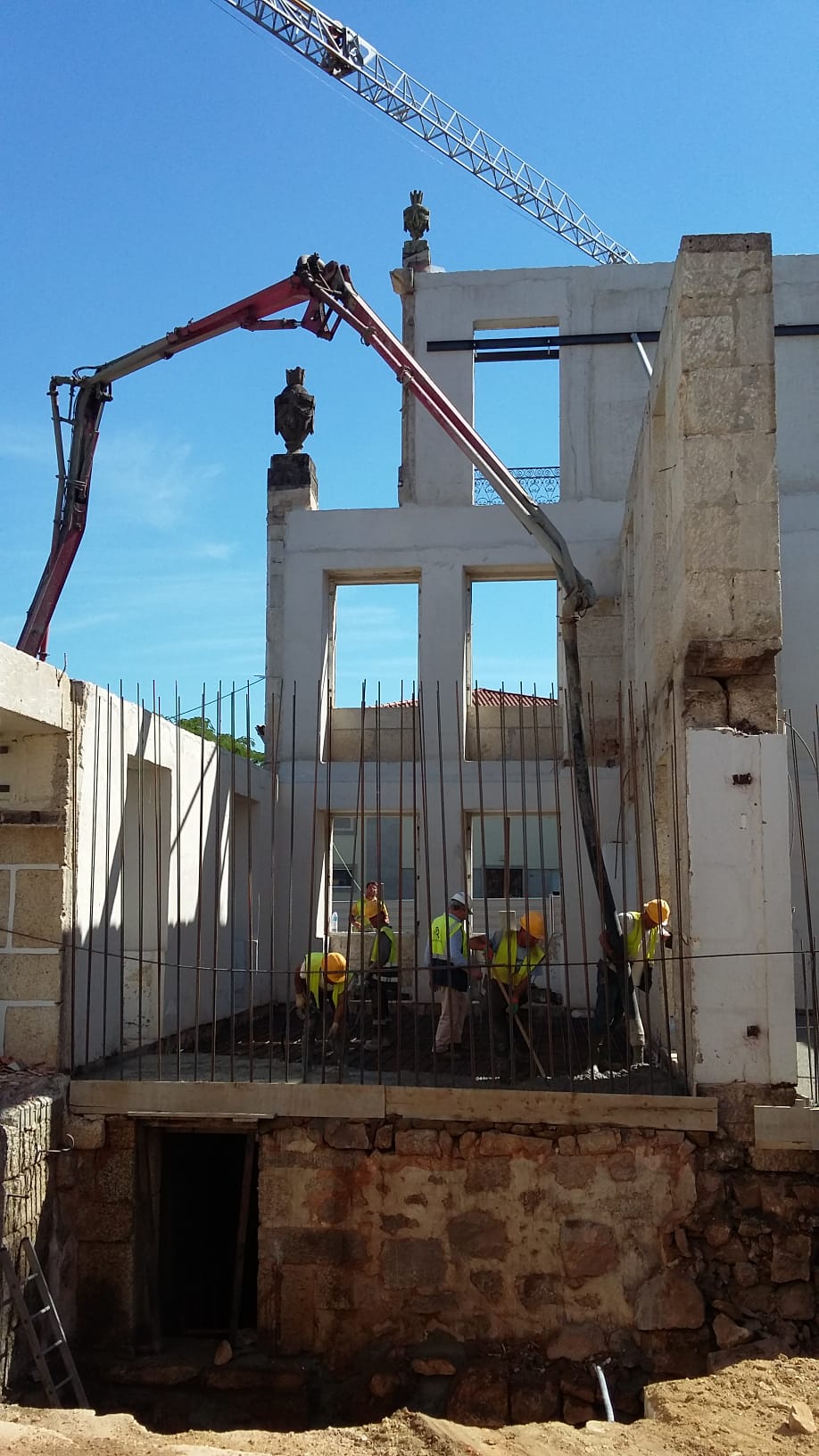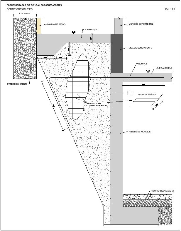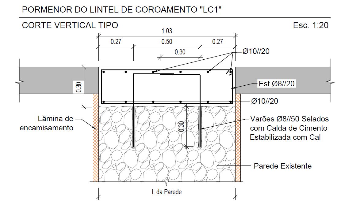 As paredes de alvenaria de pedra existentes, em granito, foram reforçadas interiormente pela aplicação de um reboco estrutural e no coroamento das alvenarias existentes foram executados lintéis de coroamento em betão armado.