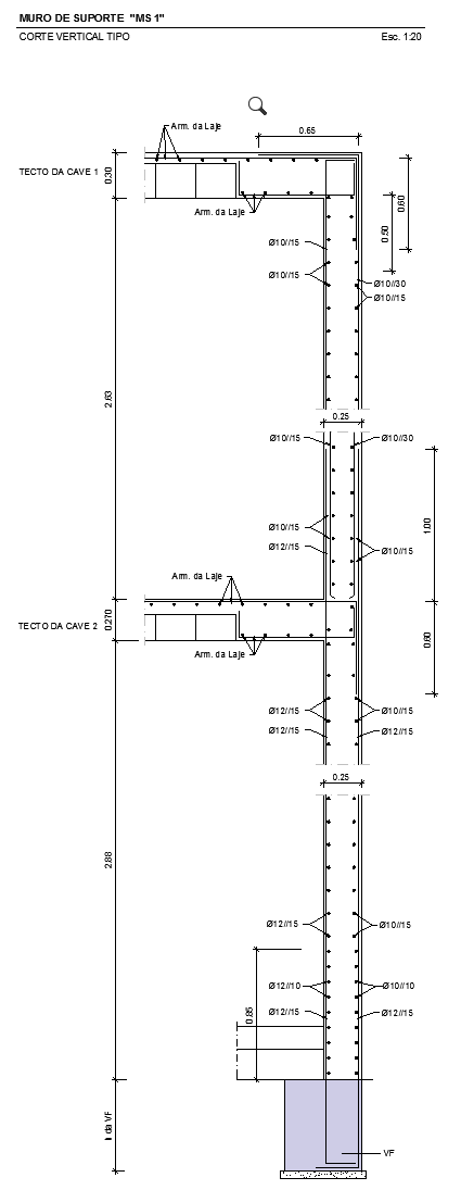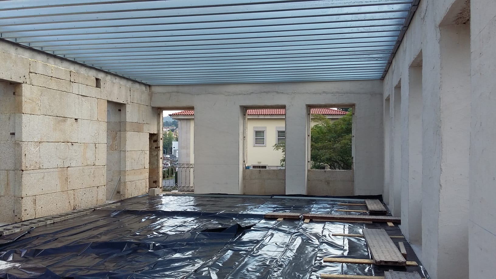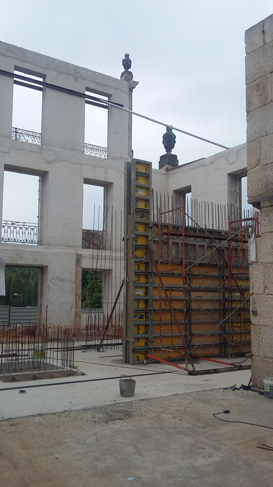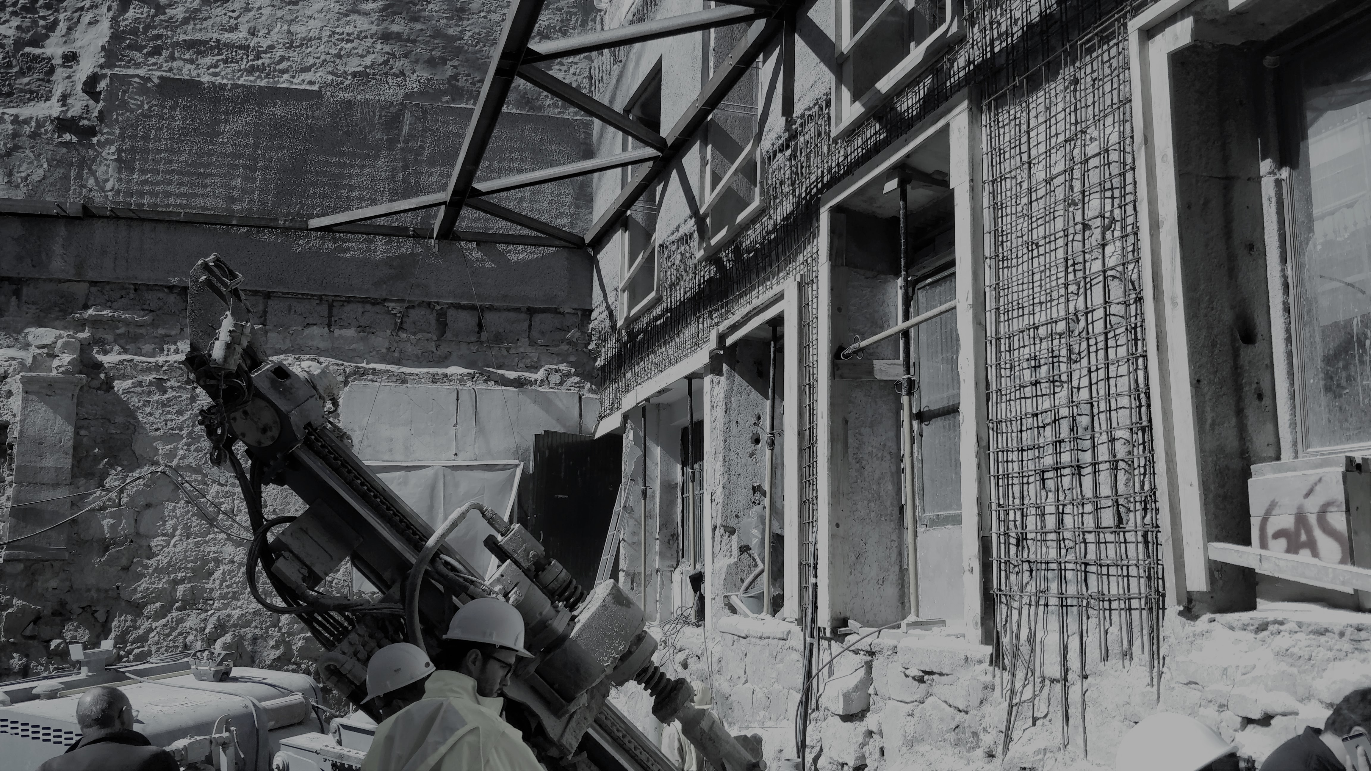 As paredes de alvenaria de pedra existentes, em granito, foram reforçadas interiormente pela aplicação de um reboco estrutural e no coroamento das alvenarias existentes foram executados lintéis de coroamento em betão armado.