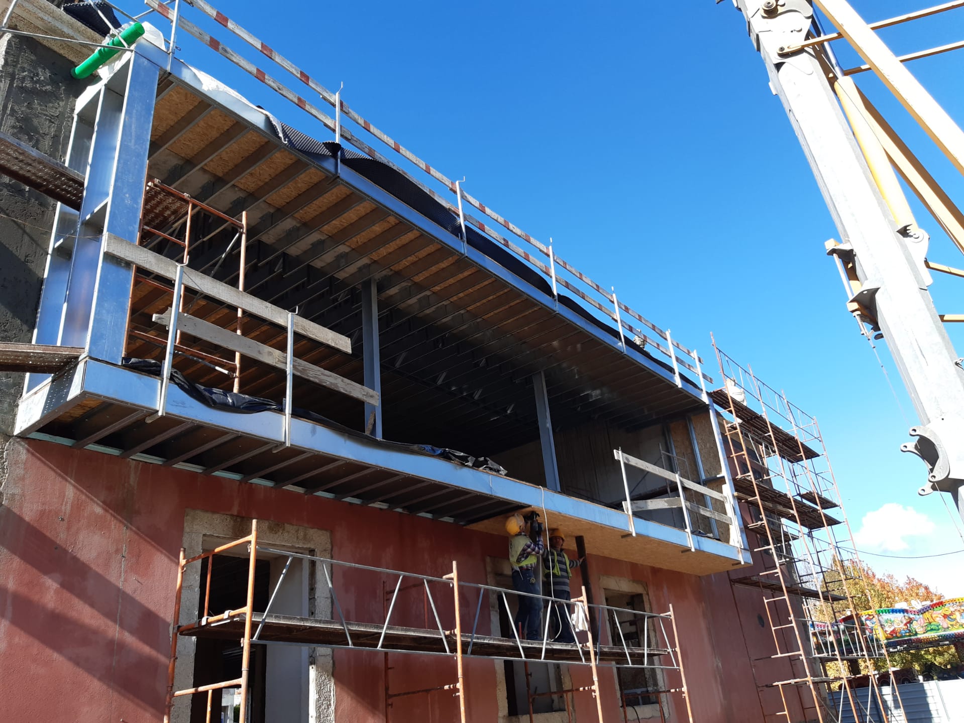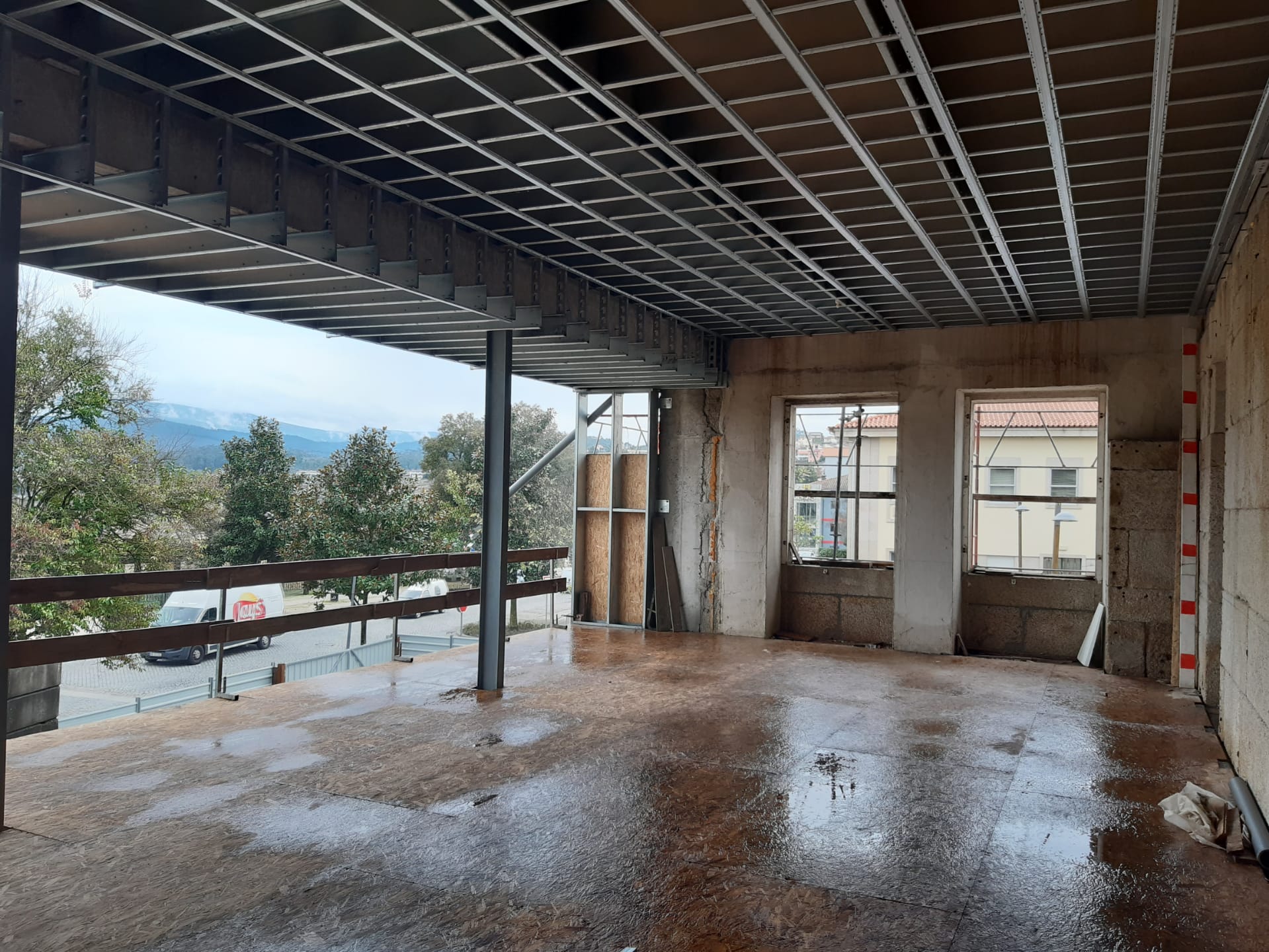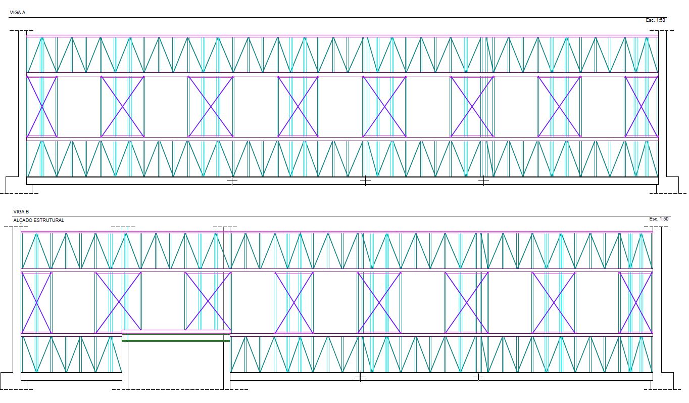 Para o vigamento principal dos pisos usaram-se perfis laminados do tipo HEA e para o vigamento secundário utilizaram-se perfis em C enformados a frio sobre os quais apoiam os pavimentos em madeira.